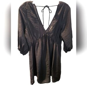 Short dress in woven fabric with a slight sheen. Low-cut V-neck at front and back, horizontal ties at back of neck, and voluminous 3/4-length sleeves with narrow, covered elastic at cuffs. Gathered seam below bust at front and back of waist. Unlined.