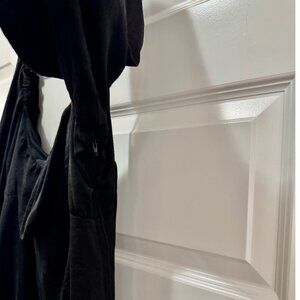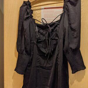 Chic black H&M puff sleeve dress with smocked cuffs and a flattering square neckline. Made with a soft satin-like fabric for a comfortable, elegant fit. The ruched detailing on the shoulders and sleeves adds a stylish touch, perfect for both casual wear and nights out.