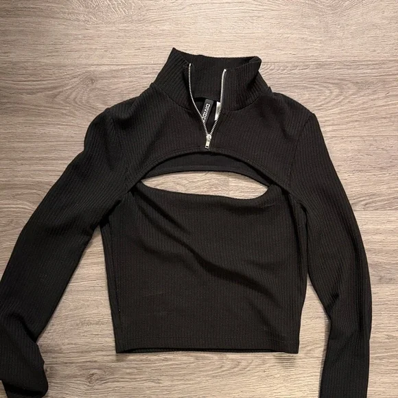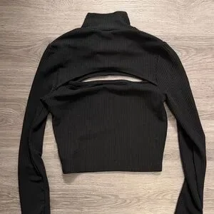 Chic black top with ribbed design. Features a zip-up collar and stylish cutout.