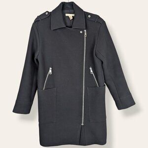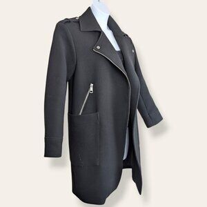 This coat by H&M has a black exterior made of a polyester/viscose/elastane blend (75/22/3) and a black interior made of 100% polyester. The coat has long sleeves, a collar, an asymmetrical silver zipper with a double breasted style, and little épaulettes that snap into place. There are also 4 pockets on the front: 2 with open tops, and 2 that zip shut. I've had this coat for several years now and I've loved it, but it's time for something new. The only thing I didn't love is that the fit is quite square. While that's the style, my hips are wider than my top so it feels a little unbalanced. That's just a personal preference, and despite the normal wear, this coat has a lot of wear left in it.