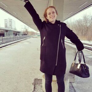 This coat by H&M has a black exterior made of a polyester/viscose/elastane blend (75/22/3) and a black interior made of 100% polyester. The coat has long sleeves, a collar, an asymmetrical silver zipper with a double breasted style, and little épaulettes that snap into place. There are also 4 pockets on the front: 2 with open tops, and 2 that zip shut. I've had this coat for several years now and I've loved it, but it's time for something new. The only thing I didn't love is that the fit is quite square. While that's the style, my hips are wider than my top so it feels a little unbalanced. That's just a personal preference, and despite the normal wear, this coat has a lot of wear left in it.