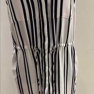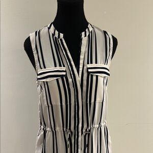 This chic mini dress from H&M features a striking black and white vertical stripe pattern, perfect for casual or work settings. The sleeveless design and collared neckline add a touch of sophistication, while the lightweight fabric ensures comfort throughout the day.