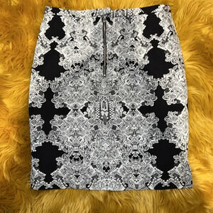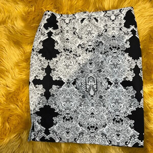 🖤😂Stunning holiday party ready elegant chic style H&M Black white lace patterned stretch slight side slit stretchy fully lined midi pencil skirt Sz 8 Approx measurements EUC photographed same day shipping from smoke free home