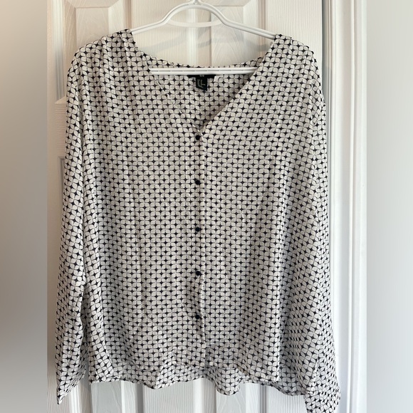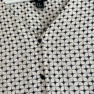 Button down blouse in geometric pattern Size 10 Navy blue & White 100% Polyester Sheer and lightweight fit