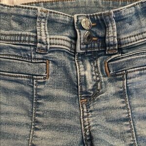 These H&M jeans feature a classic boot-cut style in a medium blue denim with a vintage-inspired faded appearance. The subtle whiskering and distressing add a naturally worn look, while the unique hem treatment provides a distinctive touch.