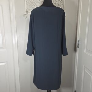 Chic dark blue dress with a sleek design. Perfect for any occasion. Has belt loops but does not have belt. Length 30" Bust 32" Sleeves 15"