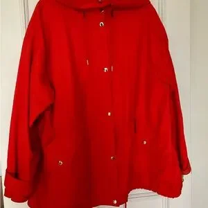 Bright red rain jacket with hood. Features button and zipper closures and front pockets. Ideal for versatile styling.