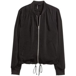 Bomber jacket iwith a zip down the front, side pockets, drawstring at the hem and ribbing around the collar, cuffs and hem.