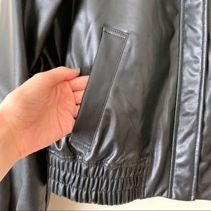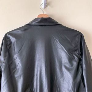 Super cute black faux leather jacket in a bomber cut from H&M. Button front, collar, elasticized waist. Perfect for cool spring or summer evenings. Easy to dress up or down.