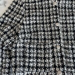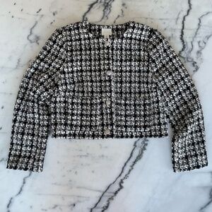 Fabulous and on trend H&M boxy, cropped jacket in a black and white checked pattern with metallic gold accents. Never worn, only tried on. Looks amazing with trousers, skirts, and denim. So versatile with a neutral colour palette with a touch of specialness with the metallic gold running through it.