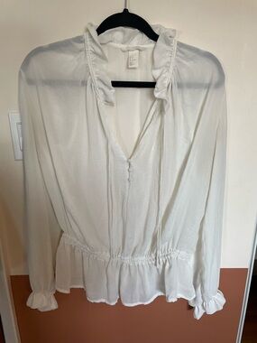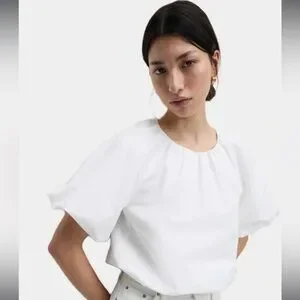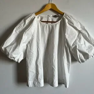 Beautiful 100% cotton blouse from H&M featuring elegant puff sleeves and a relaxed, airy silhouette. This piece has a soft structured cotton fabric that creates a modern, minimalist look perfect for everyday styling or a capsule wardrobe.