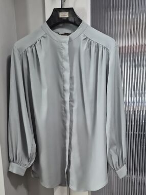 This blouse has a clean Scandinavian aesthetic that pairs beautifully with tailored trousers, denim, or skirts.