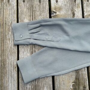 H&M grey shirt, size small. V-neck. Double-layered yoke at back with box pleat. Long sleeves with buttons at cuffs. Non stretch and slightly sheer fabric; 100% polyester.