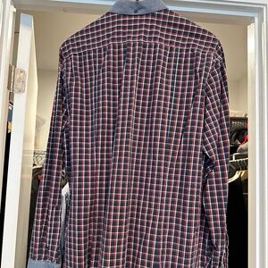 This long-sleeve button-down shirt features a stylish red, navy, and white plaid pattern. Made from lightweight fabric, it’s ideal for layering or wearing on its own.