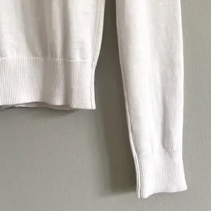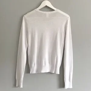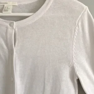 Light weight button-up 100% cotton cardigan with crew neck and ribbing at bottom and sleeve ends.
