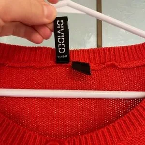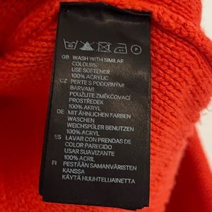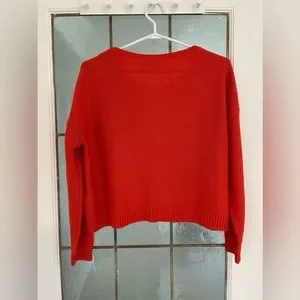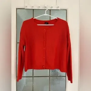 Classic H&M red/orange cardigan. I think it's a punchy red colour, a friend said it looks more orange to them. Pictures are true to how the colour looks IRL. Last few pics are shown with it compared to a more "true red" dres. Slightly cropped but not a "crop-top". Size 12 but fits me (size M/6/28) just right for a more fitted sweater. In great condition.