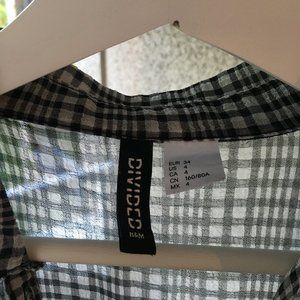 Black and white sheer checked blouse from H&M in size 4 (small/extra small). This shirt is a soft, synthetic fabric (super easy to wash and dry). It has a cute collar and ruffle detail along the yoke and shoulders.