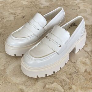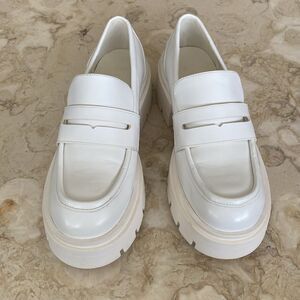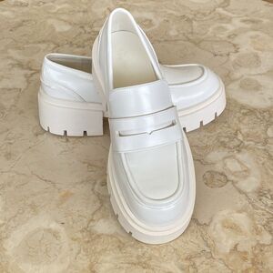 In as new condition H&M penny loafers in white faux leather with a decorative tab at front. Satin lining, faux leather insoles, and chunky, patterned soles. Heel height 2 1/4 in.
