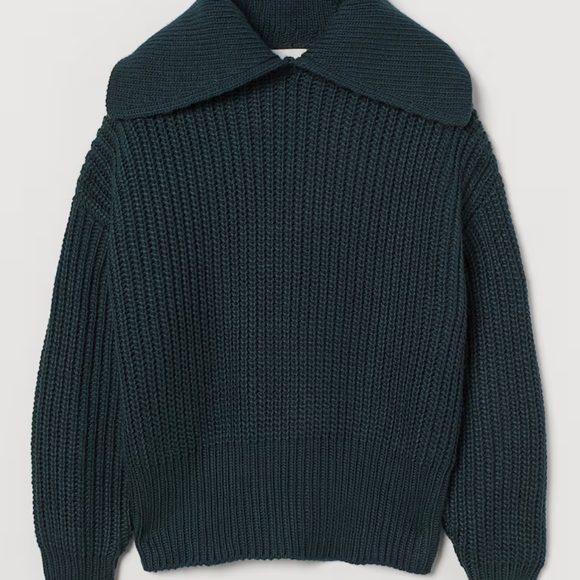 Comfy, boxy, relaxed-fit sweater in soft, rib-knit fabric with wool content. Wide collar, dropped shoulders.