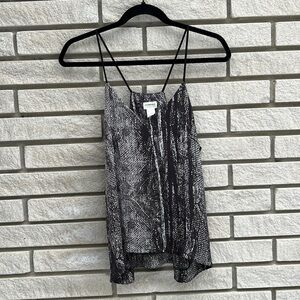 Lightweight and flowy Racerback tank. Material has a satiny feel with a slight sheen. Racer back with thin spaghetti straps. All over pattern. Slight high-low hem.