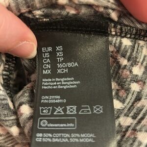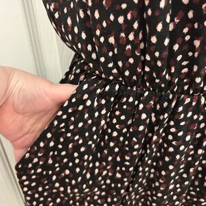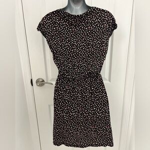 Easy and cute dress with pink and mauve pattern on black background. Tank top sleeves and wide neck with an elastic waist providing easy dress to throw on for work or going out. 18” pit to pit. 12” across elastic at waist when unstretched. Stretches to 17” across elastic. 50% cotton, 50% modal. European sized XS, US size S.