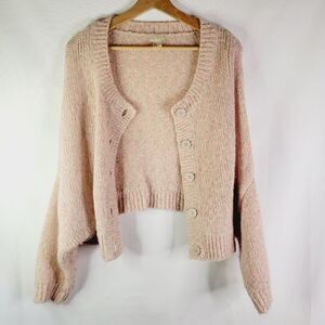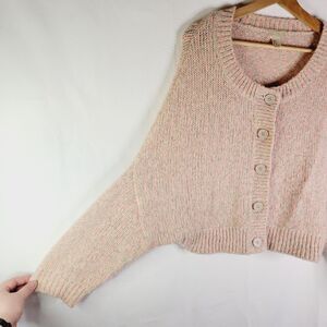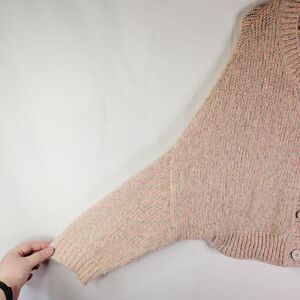 Stay warm and stylish with this cozy pink knit sweater, pale pink base and big buttons, with flecks of neon pink throughout the fibers which gives it a cute femme modern twist. Perfect for any casual outing. Looks super cute with blue jeans. Sits at a sort of cropped level and the sleeves are a loose fit like batwing style. Spare button included. EUC.