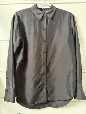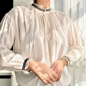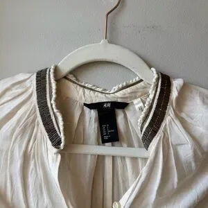 Soft cream button-down blouse from H&M. Lightweight fabric with gentle gathers at the neckline. Long sleeves with decorative trimmed smocked cuffs. Subtle pleating for a relaxed, feminine drape. Versatile piece for casual or elevated looks.