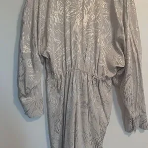 Short, jacquard-weave dress in viscose fabric. Low-cut V-neck, heavily dropped shoulders, long sleeves, and cuffs with slit and button. Tie detail at front of waist and elasticized seam at back of waist. Unlined.