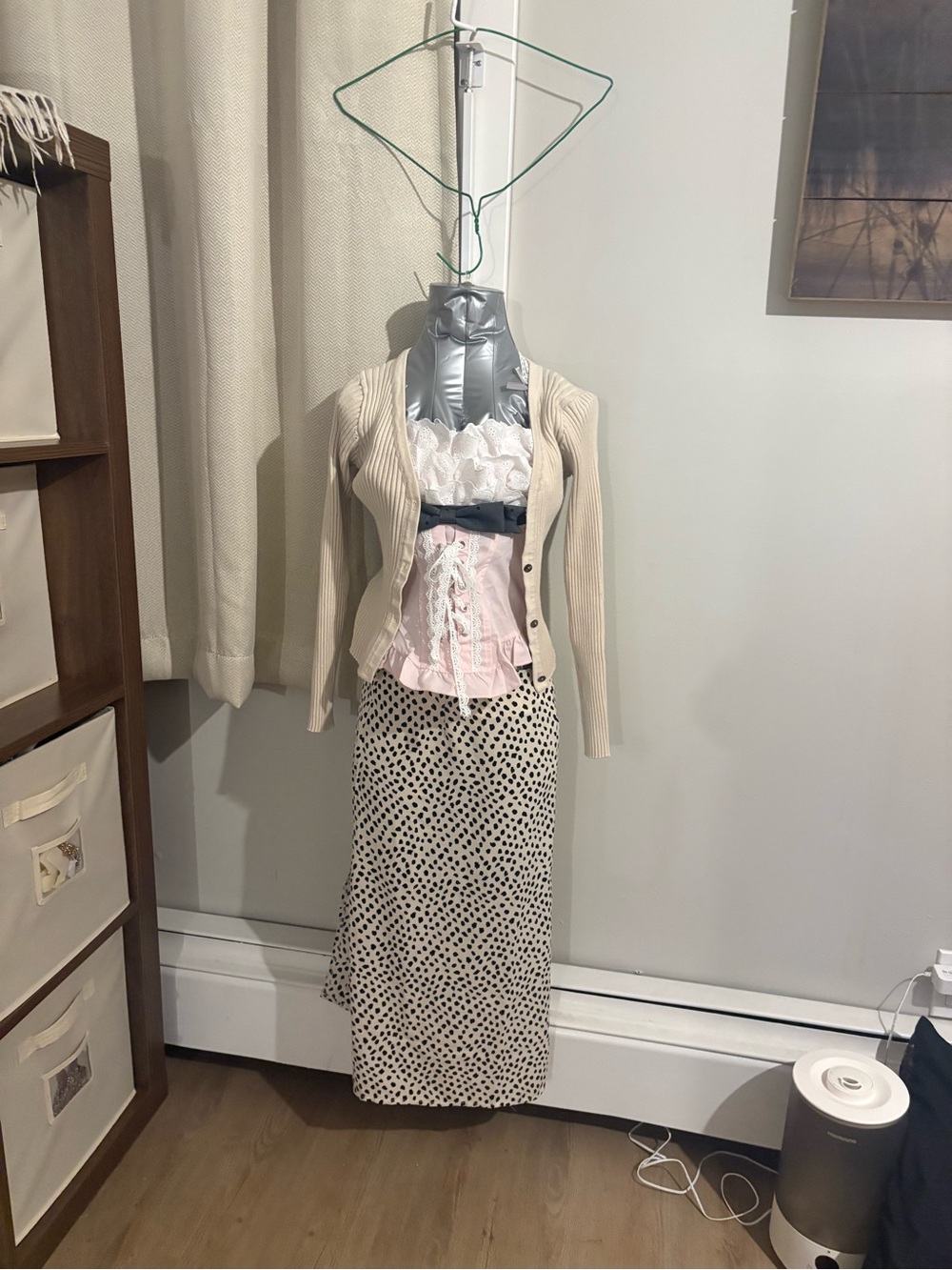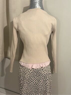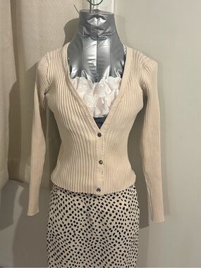 Light cream ribbed cardigan from H&M. Soft knit with front buttons. Slim, fitted silhouette. Easy to layer over blouses or dresses.