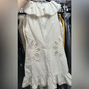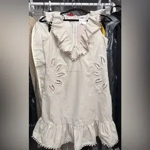 Stylish mini dress with ruffled neckline and skirt. Features intricate cut-out details. Perfect for a chic look.