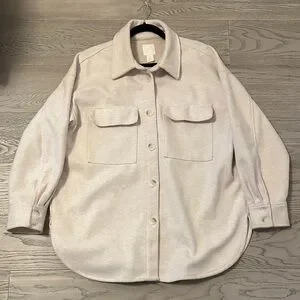 Stylish cream shacket by H&M. Features button front and two large chest pockets. Ideal for versatile wear and perfect for layering.