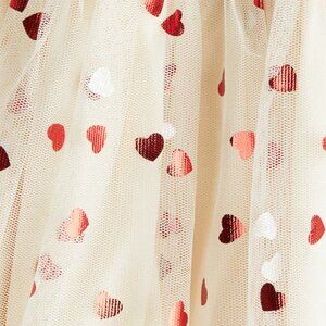 Round neckline, long sleeves, and a gathered, ruffled seam above a tulle skirt.