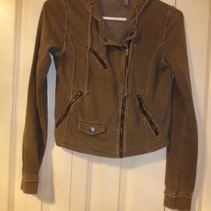 In good condition! The stitching design has intentional distressing. Has 2 pockets on the side and one fake pocket with a single snap button. Cute casual hoodie!