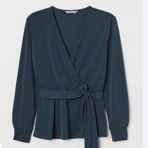 Chic wrap blouse with tie waist. Long sleeves. Versatile style.