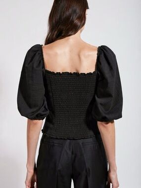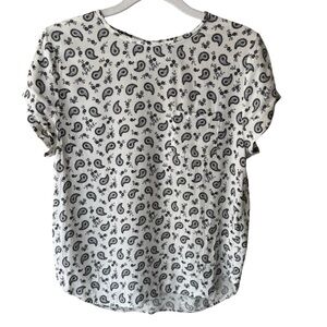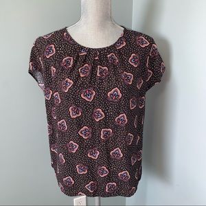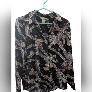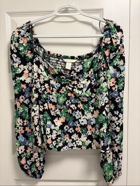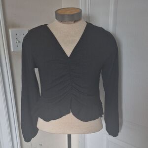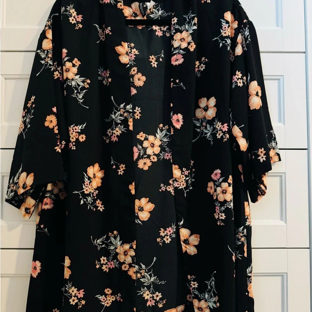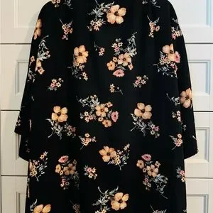Soft black blouse with a scattered floral print. Features peach and light pink blossoms with delicate green foliage. Lightweight and flowy fabric. Classic three quarter length sleeves and easy neckline.