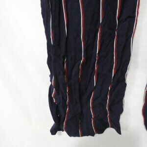 These navy blue wide leg pants feature vertical stripes in white and red