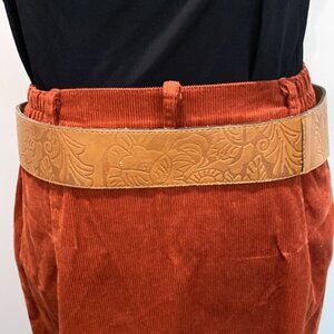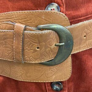 Stylish embossed belt. Features floral pattern. Perfect for any outfit.