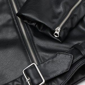 Biker jacket in faux leather. Notched lapels with decorative snap fasteners, diagonal zipper at front, and long sleeves with zipper at cuffs. Front pockets with zipper, small coin pocket with flap and snap fastener, and removable, adjustable belt at hem with metal buckle. Lined.