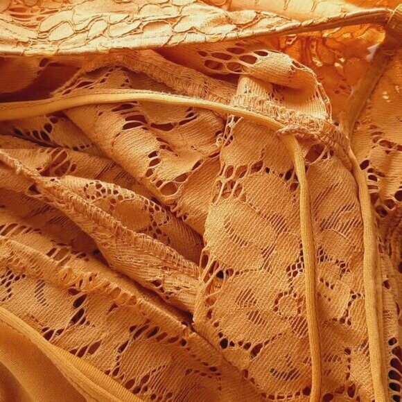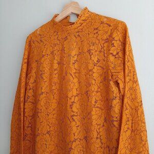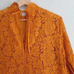 • Long sleeve high neck mini knee length shift dress in dark mustard yellow /orange with all-over floral lace pattern.