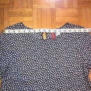 Chic and feminine blouse with navy blue base and allover white floral print. Features a flattering peplum hem, round neckline, and 3/4 sleeves for a versatile fit. Lightweight fabric, easy to style for casual or workwear looks.