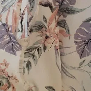 Chic top with floral design. Features purple, green, and pink hues.