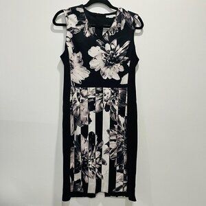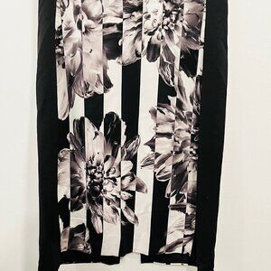 Beautiful classic black and white sheath dress from H&M in excellent preowned condition, only flaw to note is some slight discoloration on the metallic zip pull tab at the back and the size tag has been removed but measurements indicate a size Medium / 8 . Dress shown in the stock version is the shorter/high neck version of the dress in this listing. This dress features a gorgeous graphic floral and striped pattern, sleeveless sheath silhouette, flattering V neck, exposed back zip and knee-length hem. Dress has a small slit at the back for walking ease