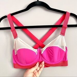 Hot pink, bright red, & cream (mesh) colour block colorblock underwire bra with a crisscross back by H&M, size 34B. Red trim has a grosgrain texture to it.
