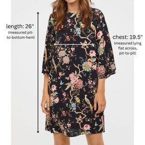 This loose shift-style midi dress is perfect for spring and summer. It features a floral, birds-of-paradise pattern and a button closure at the back.