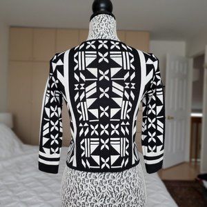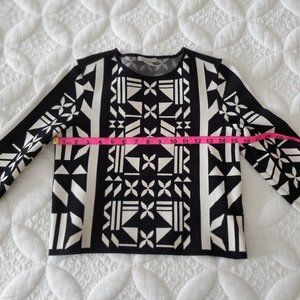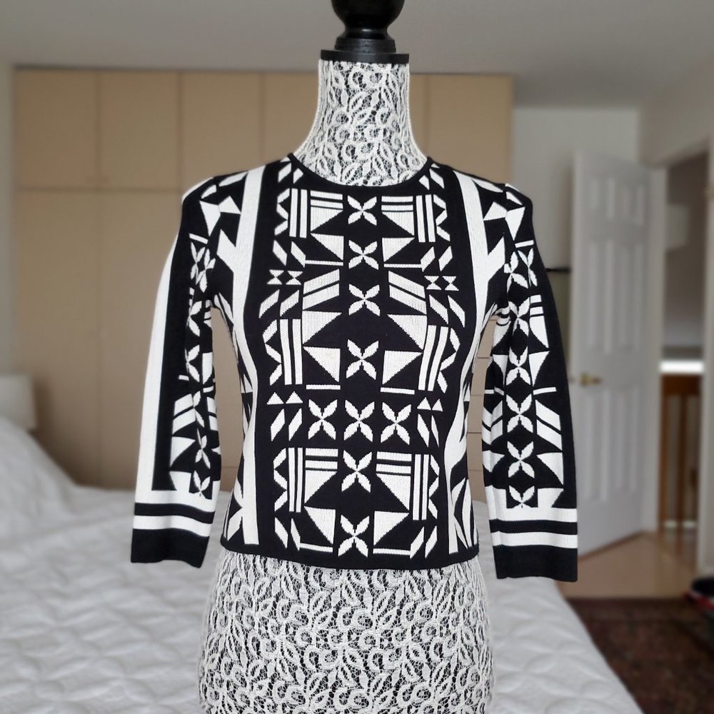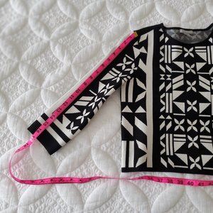 Black and white knit top. The fabric is thick and stretchy. Very flattering with high wasted pants.