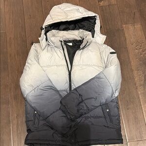 Stylish gradient puffer jacket with a hood. Features a blend of gray and black colors.