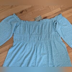 This H&M sundress features a smocked bodice and an off-the-shoulder neckline, perfect for a casual day out or resort wear. The dress showcases a beautiful blend of green and blue hues, complemented by 3/4 length puff sleeves for a touch of elegance. Its maxi length and airy fabric make it ideal for warm weather, offering both style and comfort.