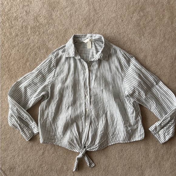 Stylish button-down with classic stripes. Features a tie-front detail. Ideal for casual wear. Sz M. Cropped.