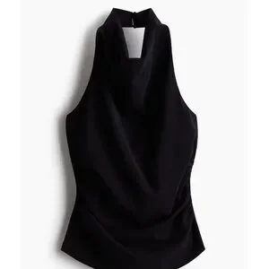 This elegant black halter top is perfect for any occasion. Its sleek design offers a sophisticated look.