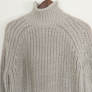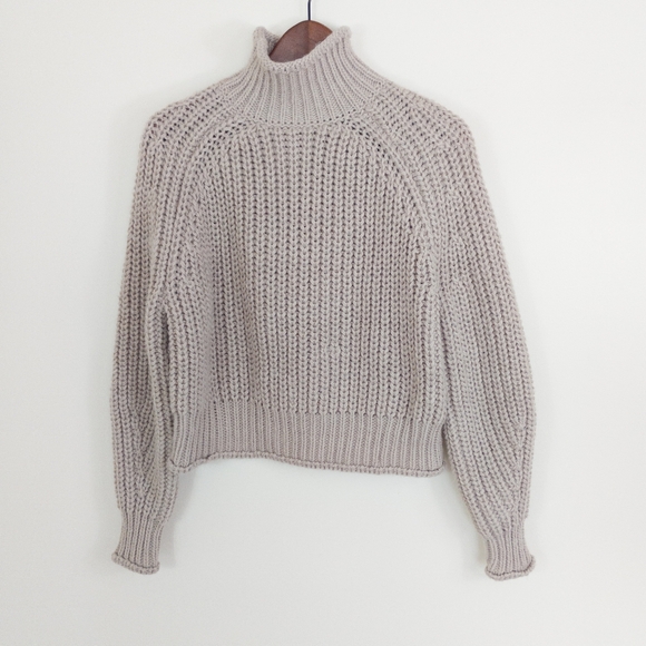 Boxy-style jumper in a soft knit containing acrylic/wool blend. Turtle neck with a rolled edge, long, wide raglan sleeves and wide, roll-edge ribbing at the cuffs and hem.